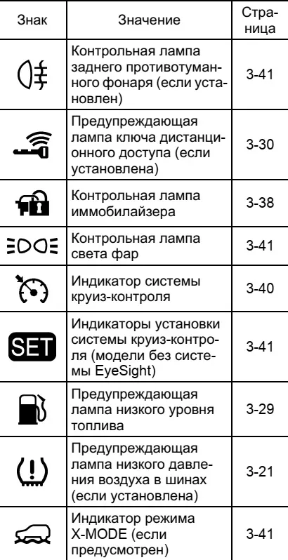 ![]() Индикатор установленной скорости круиз-контроля (для моделей без системы EyeSight) Этот индикатор активируется, когда скорость установленного круиз-контроля зафиксирована. |