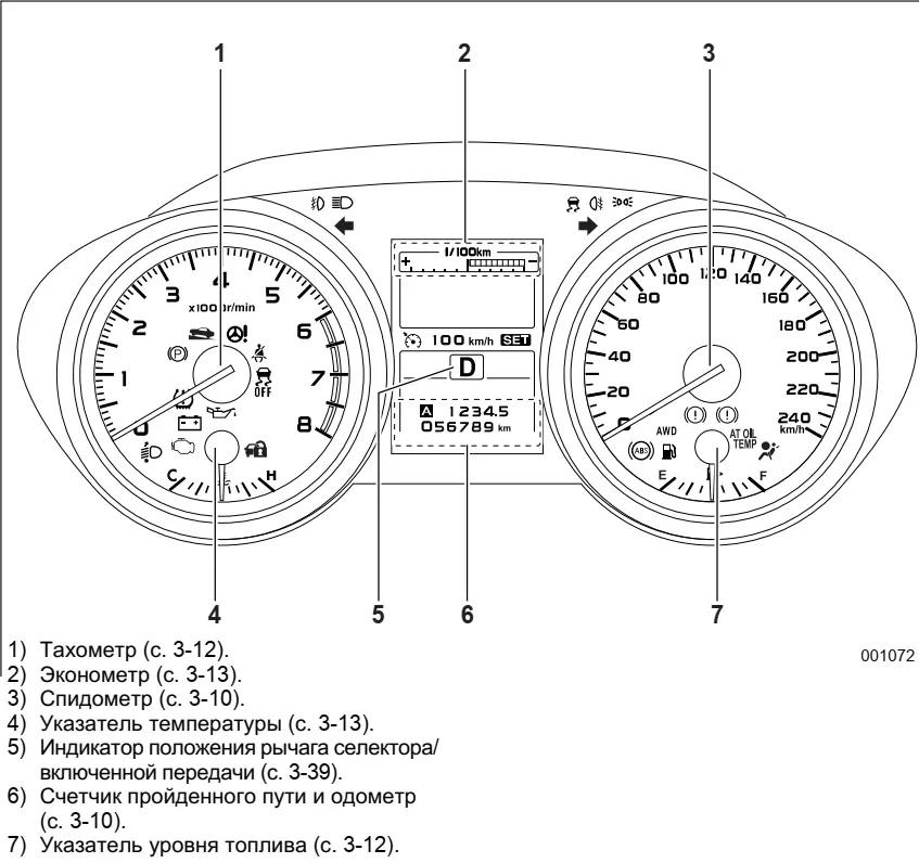 ![]() Индикатор системы SRVD (если установлен) Этот индикатор показывает неисправность системы SRVD. Рекомендуется обратиться к дилеру SUBARU для диагностики. |