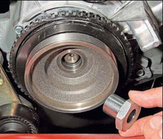 - Установите специальный инструмент на шкив коленвала для предотвращения его вращения во время отворачивания болта крепления.