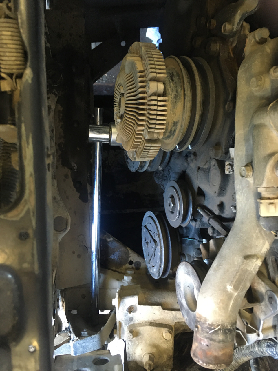 - Используя гаечный ключ или гайковерт, ослабьте гайку, которая крепит шкив коленвала к коленвалу. Может потребоваться использование специального инструмента для удержания шкива коленвала, чтобы предотвратить его вращение.