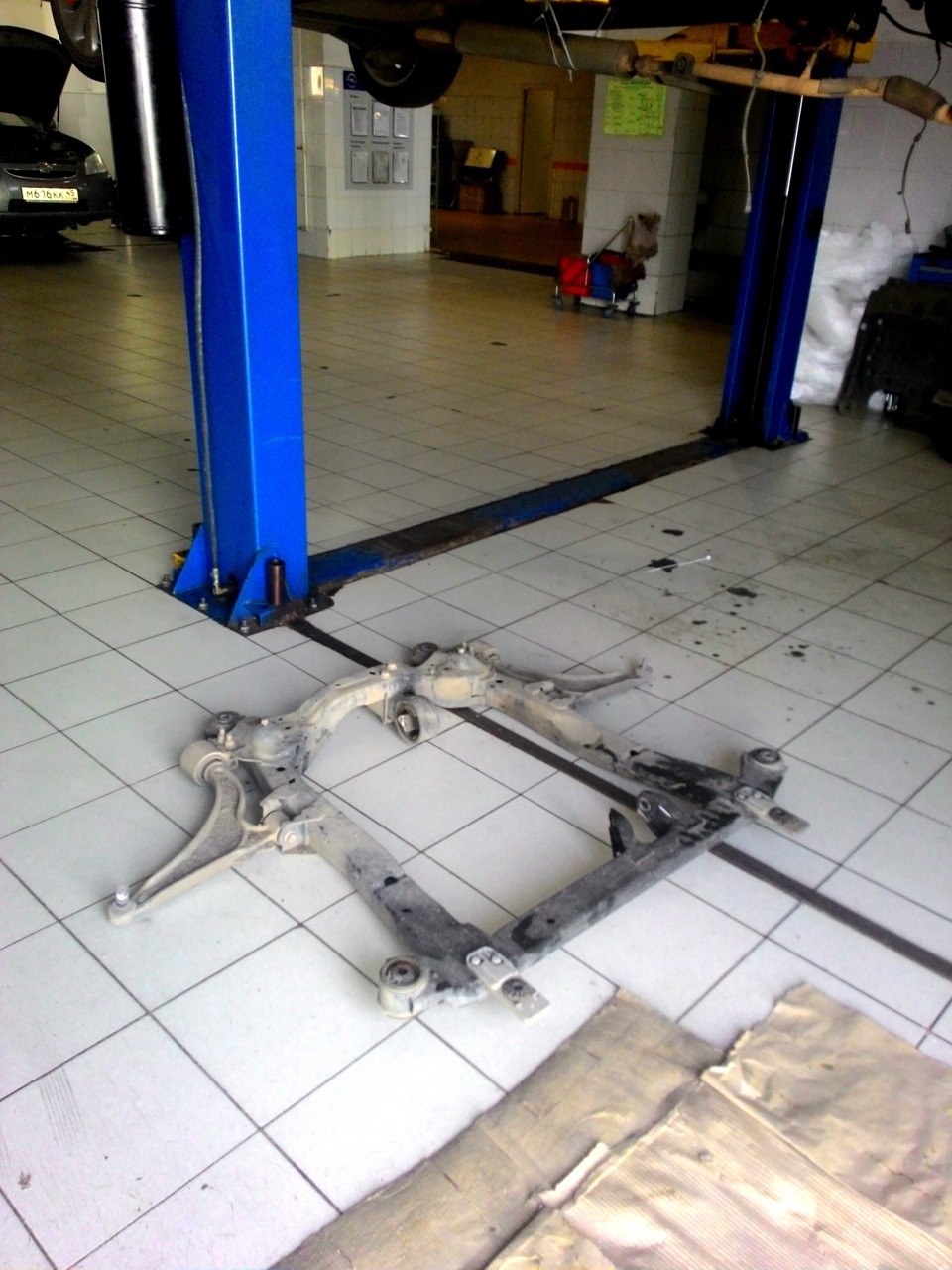 - Опустите автомобиль с подъемных устройств и уберите подставки.